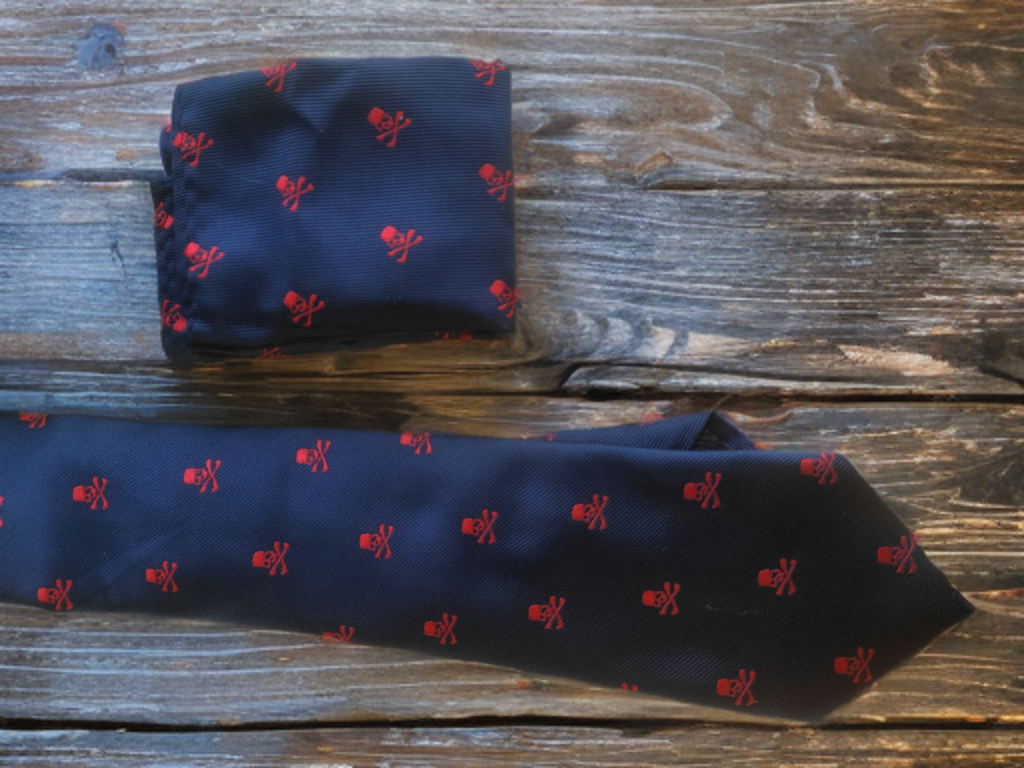 Gent's skull and Crossbones design tie and matching pocket square. Perfect Distinct, decorative, dapper business wear! .......make the smart choice and be a Jolly Roger!