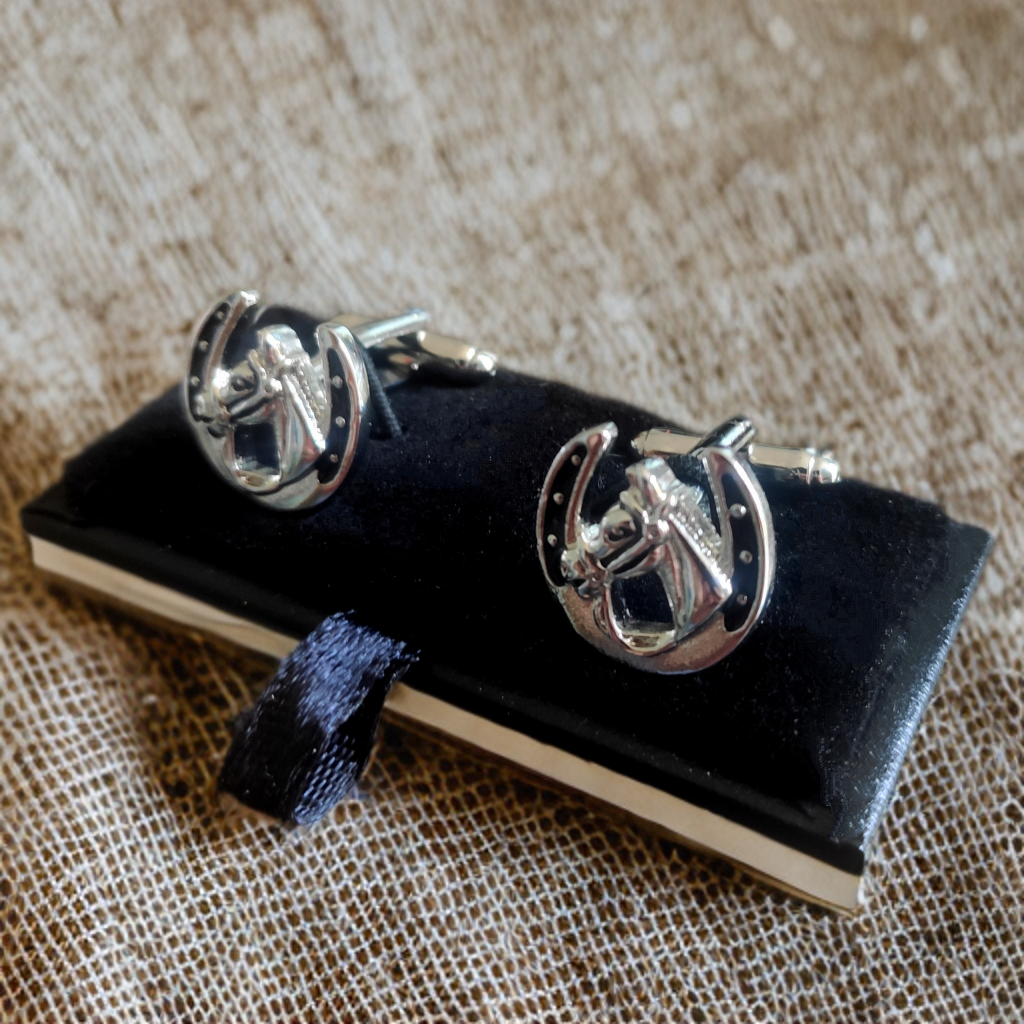 Gents lucky horseshoe cufflinks, featuring a horse head and shoe design in silver and black! Get ahead of the field with these lucky charm equine accessories