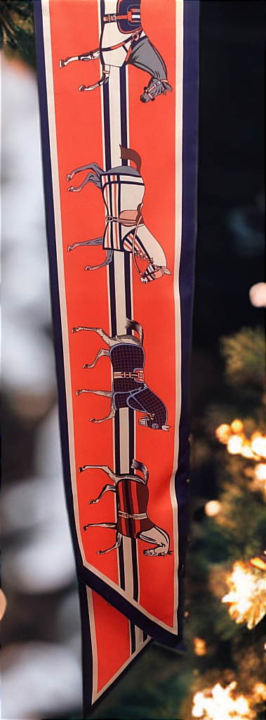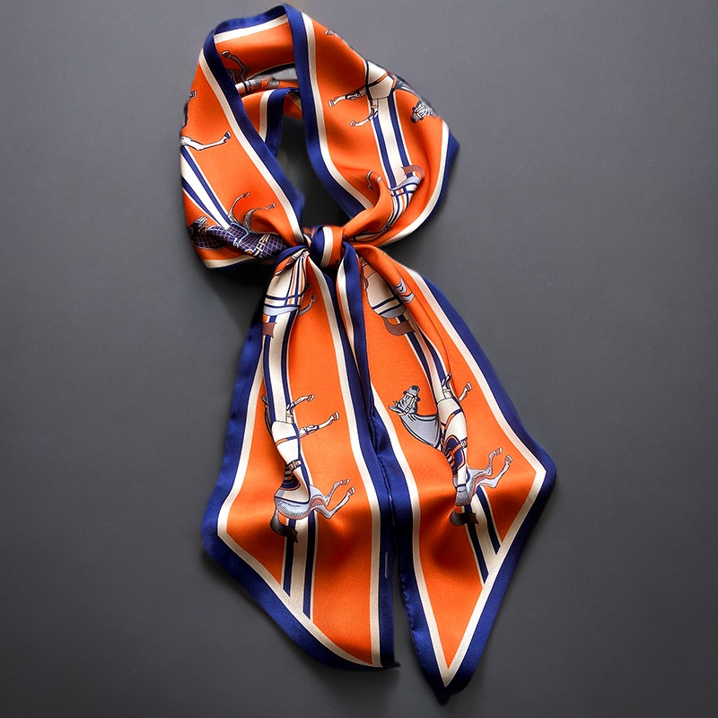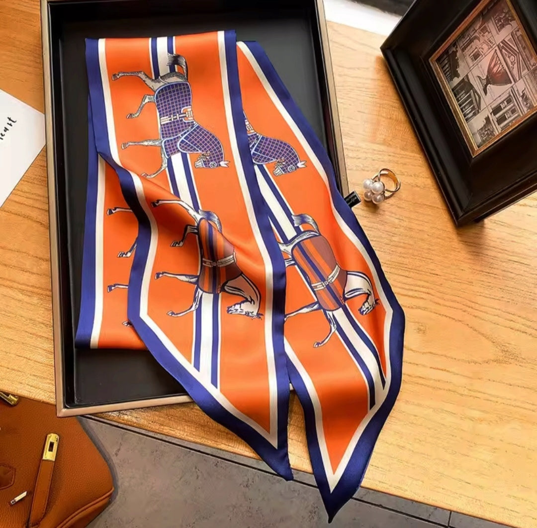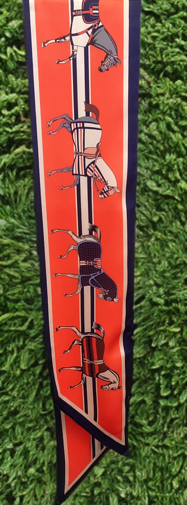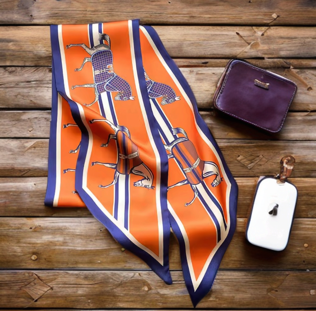 Elegant ladies horse print design ribbon scarf in striking navy blue and Orange colours that will make a lasting impression and add classic style to any outfit with a luxury silk feel. Measures 140 x 14 cm
