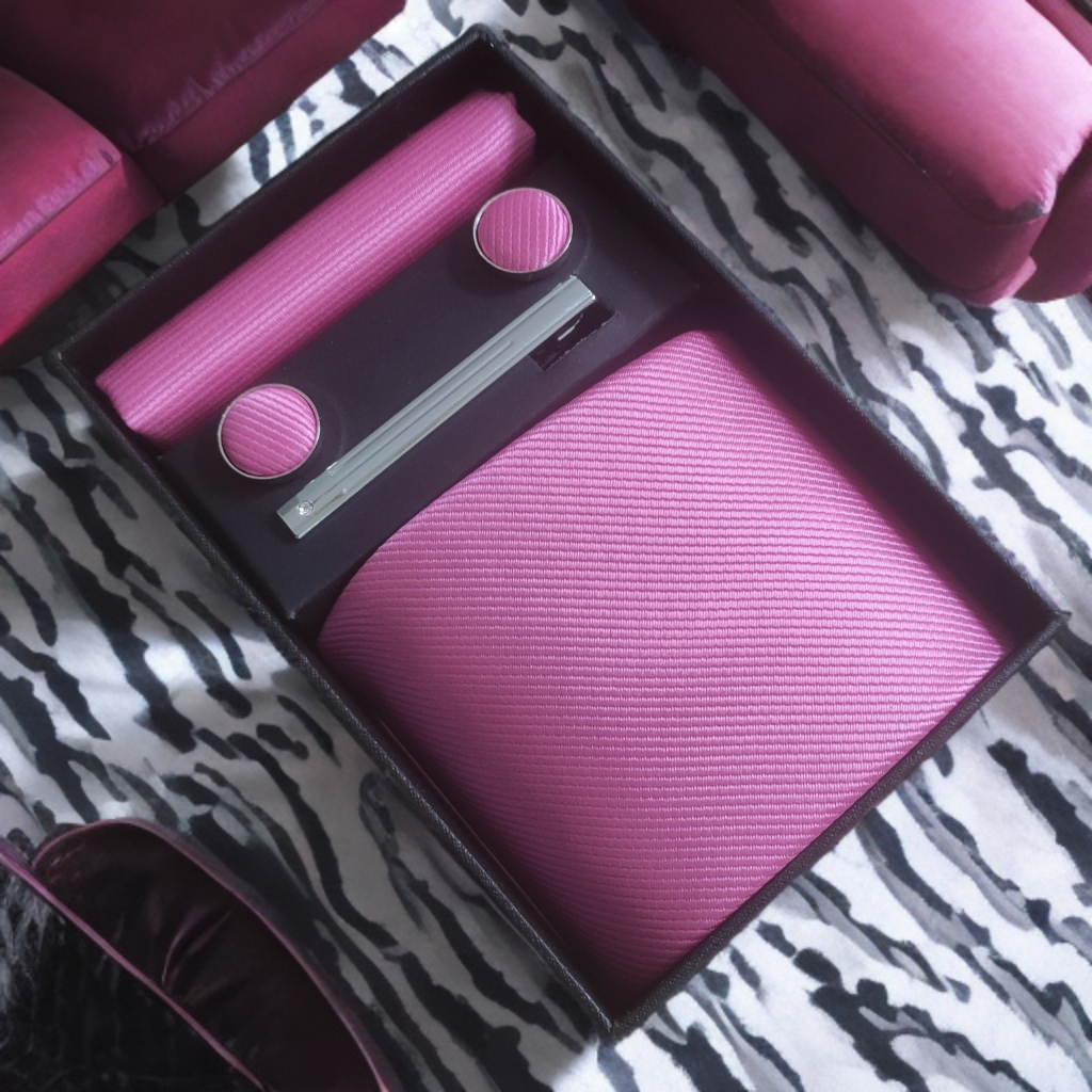 Men's Tie Set including matching pocket square and cufflinks and Tie Clip in Bright Shocking Pink colour, in presentation gift box. Perfect for colour coordination on special occasions including weddings, christenings, engagement party, a day at the races or just smart everyday business wear!
