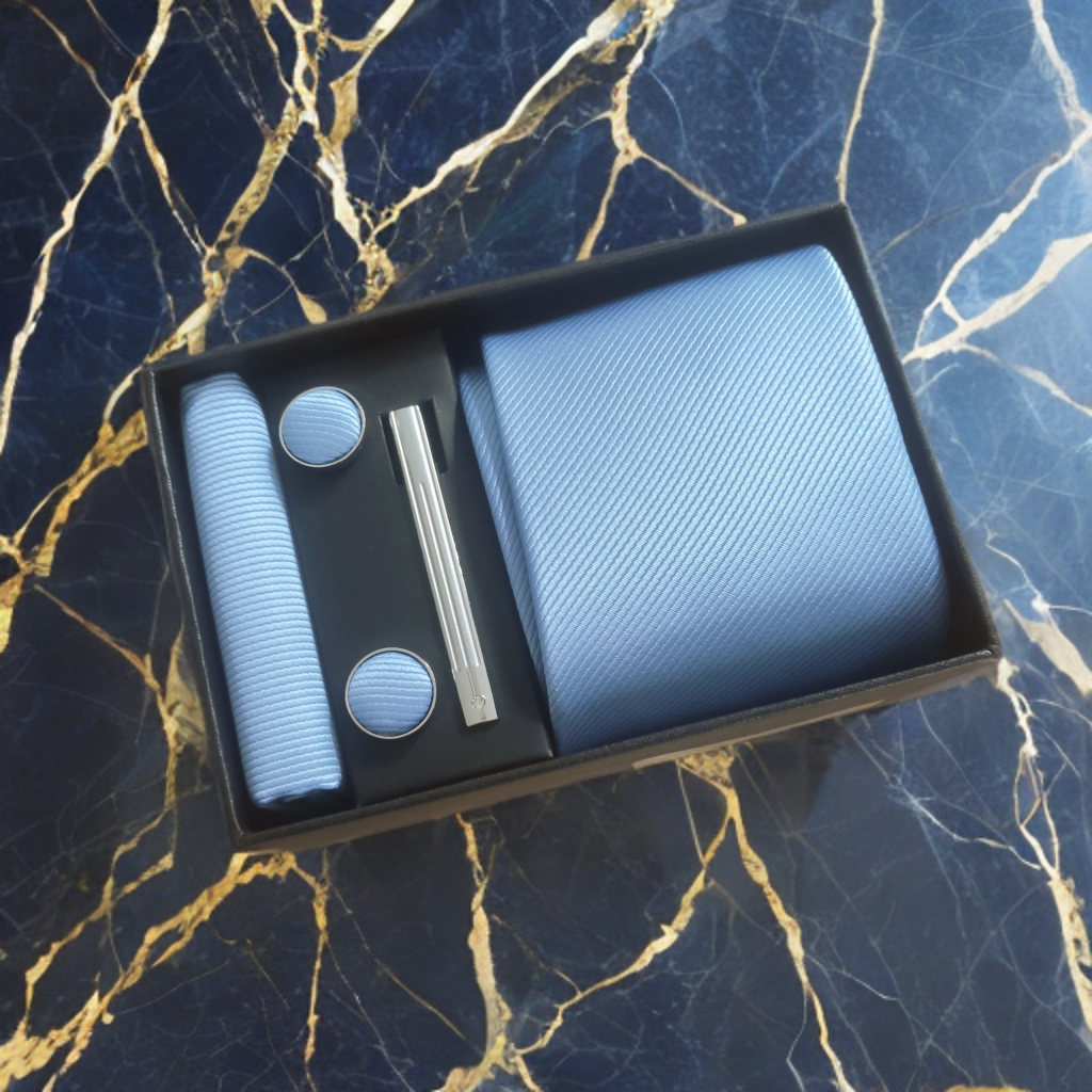 Men's Tie Set including matching pocket square and cufflinks and Tie Clip in Light Blue colour, in presentation gift box. Perfect for colour coordination on special occasions including weddings, christenings, engagement party, a day at the races or just smart everyday business wear! Luxury Silk effect!