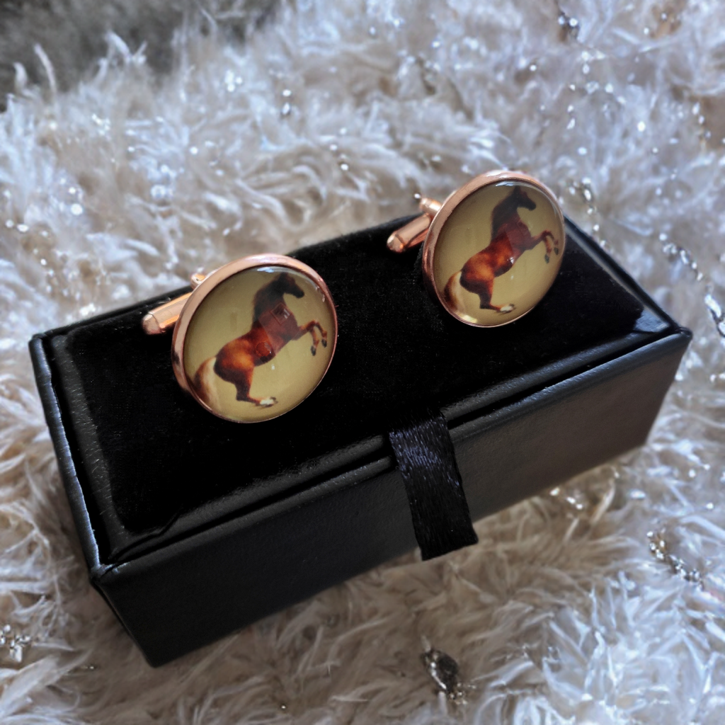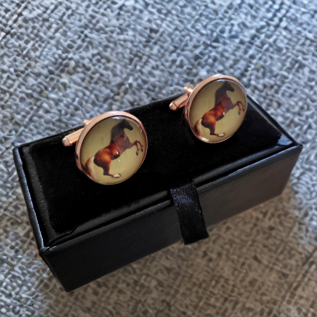 Stylish Classic Rose Gold Cufflinks featuring the famous George Stubbs portrait of Whislejacket an Arabian chestnut horse rearing up on hind legs! Probably The most well known horse portrait in the world! A must for equestrians and art lovers everywhere!
