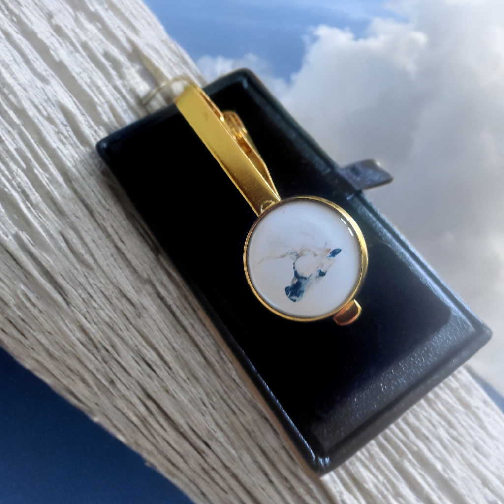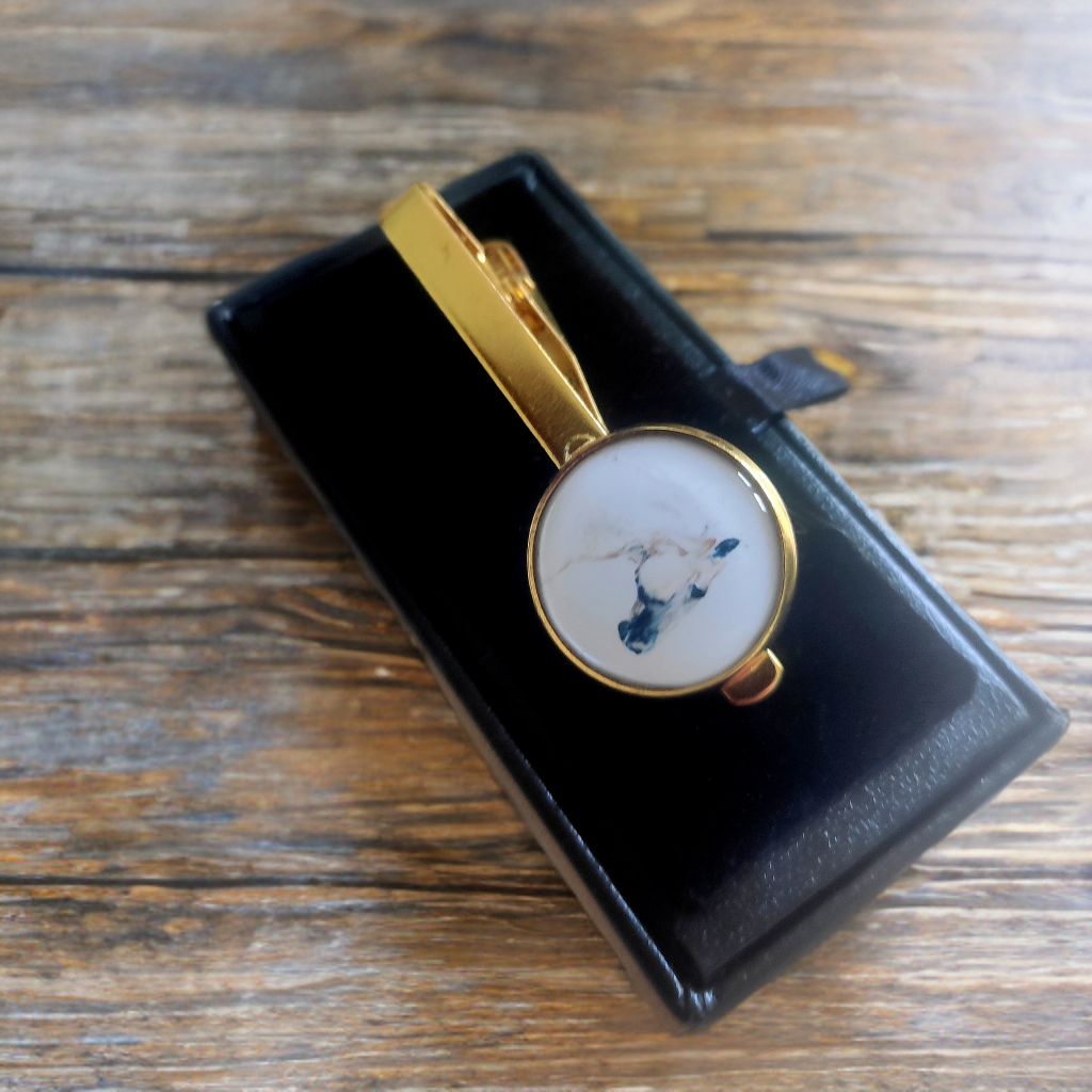 Mens Elegant Gold Tie Clip featuring a classic white stallion horse portrait by Dent Fine Art. Great gift for horse lovers.